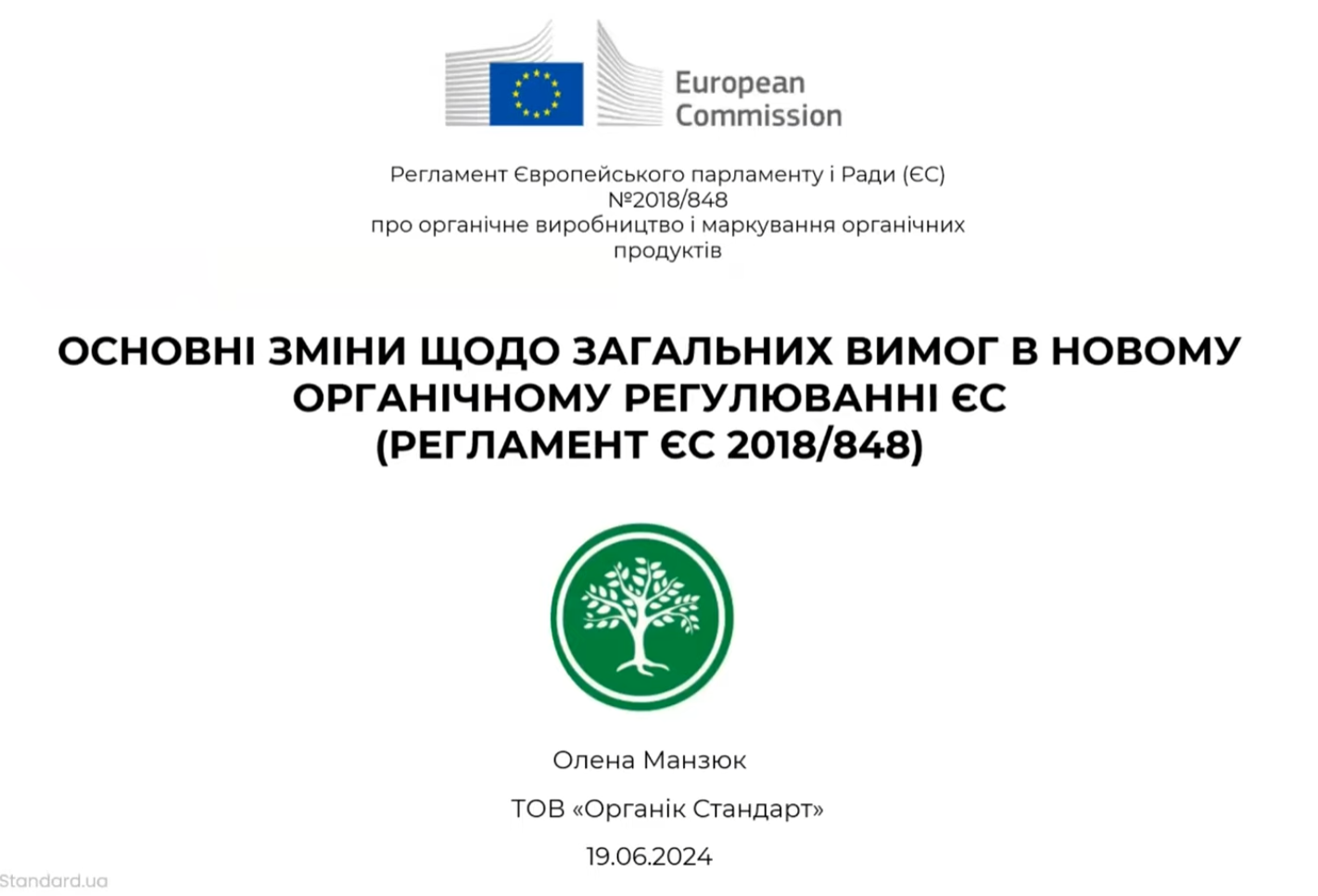 Презентація Олени Манзюк: «Основні зміни щодо загальних вимог в новому органічному регулюванні ЄС (Регламент ЄС 2018/848)», 2024 р.